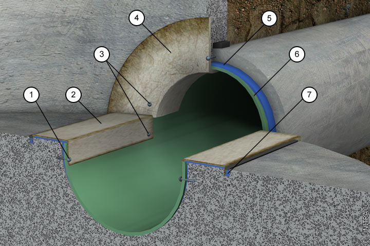 In diesem Fall wird der ausgehärtete Inliner halbschalenförmig aufgeschnitten und mit GFK-Handlaminat, Dichtungsmitteln, V4A-Schrauben und Dübeln mit den Auftritten verbunden. Die Randbereiche werden mit elastischen Dichtmitteln abgedichtet. Die Auftritte selbst werden mit GFK-Handlaminat geschützt (Bild 5.3.2.4.1.1.1.4-1) (Abschnitt 5.3.2.5) [Wagne91] .