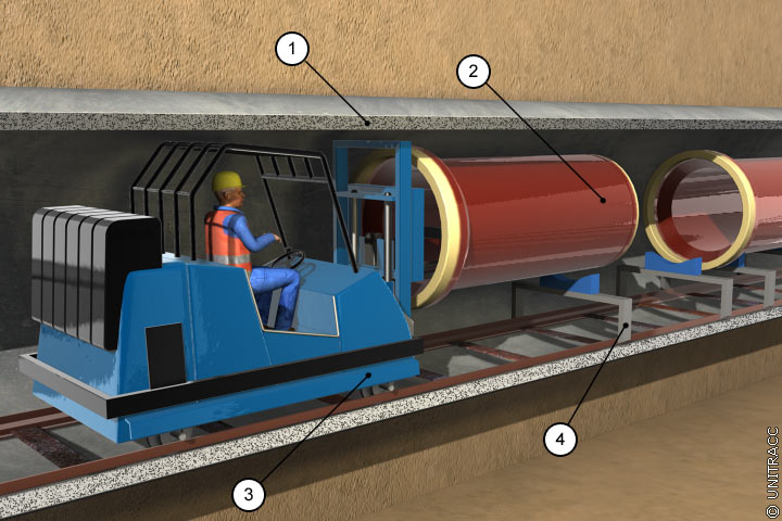 Einfahren von Steinzeugrohren mit Hilfe eines schienengebundenen Rohrverlegewagens in Anlehnung an [Möhri81] [Quelle: STEIN Ingenieure GmbH] |