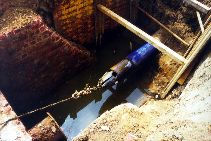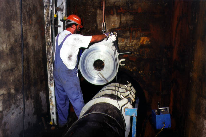 Auf das erste im Startschacht befindliche Rohr wird ein Zugkopf aufgesetzt, das Zugseil befestigt und das Rohr so weit in die zu sanierende Haltung eingezogen, daß der Rohrverbindungsbereich noch im Schacht verbleibt. Mit diesem wird das nächste Rohr zugkraftschlüssig verbunden, z.B. mittels Heizelement-Stumpfschweißung (Spiegelschweißung) bei PE-HD-Rohren (Animation 5.3.2.2.2.4.1.1-1) (Bild 5.3.2.2.2.4.1.1-1) (Bild 5.3.2.2.2.4.1.1-2) (Bild 5.3.2.2.2.4.1.1-3) , Verschraubung (Animation 5.3.2.2.2.4.1.1-2) (Bild 5.3.2.2.2.4.1.1-6) , speziellen Steckverbindungen (Bild 5.3.2.2.2.4.1.1-2) (Bild 5.3.2.2.2.4.1.1-3) (Bild 5.3.2.2.2.4.1.1-4) (Bild 5.3.2.2.2.4.1.1-5) (Bild 5.3.2.2.2.4.1.1-7) (Bild 5.3.2.2.2.4.1.1-8) (Bild 5.3.2.2.2.4.1.1-9) oder Schellen mit Zugstangen (Bild 5.3.2.2.2.4.1.1-4). Die so verlängerte Rohrleitung wird z.B. mittels Seilwinde oder Greifzug vom Zielschacht aus um eine Rohrlänge vorgezogen.