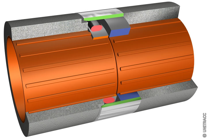 Eine Alternative zur Laminatverbindung bei GFK-Rohren stellt die im (Bild 5.3.2.2.2.2-11) dargestellte Injektionskupplung dar. Sie basiert auf einer GFK-Überschiebkupplung mit vier Elastomerdichtungen und einem zwischen jeweils zwei Dichtringen umlaufenden Hohlraum, der mit einem Reaktionsharz verfüllt wird.