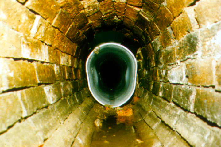 Bei Bedarf ist es auch möglich, auf serienmäßig hergestellte Rohre mit anderen Querschnittsformen zurückzugreifen, z.B. Betonrohre mit Eiquerschnitt oder spezielle Rohre mit den unterschiedlichsten Querschnittsformen wie z.B. aus glasfaserverstärktem Kunststoff (GFK) [FI-Klug] [Gale81a] [FI-Meyerb] oder glasfaserverstärktem Beton (GFB) [Gale81b] , Reaktionsharzbeton [FI-Meyerb] [Schwa91] [NN96g] , PE-HD (Bild 5.3.2.2.2.2-1) oder PUR-beschichteten Stahlrohren (Patent-Nr. P 2854.224.7) [FI-Feldm] .