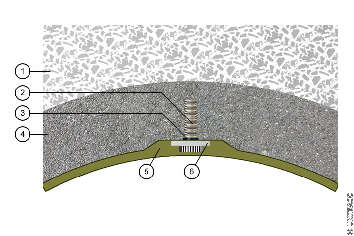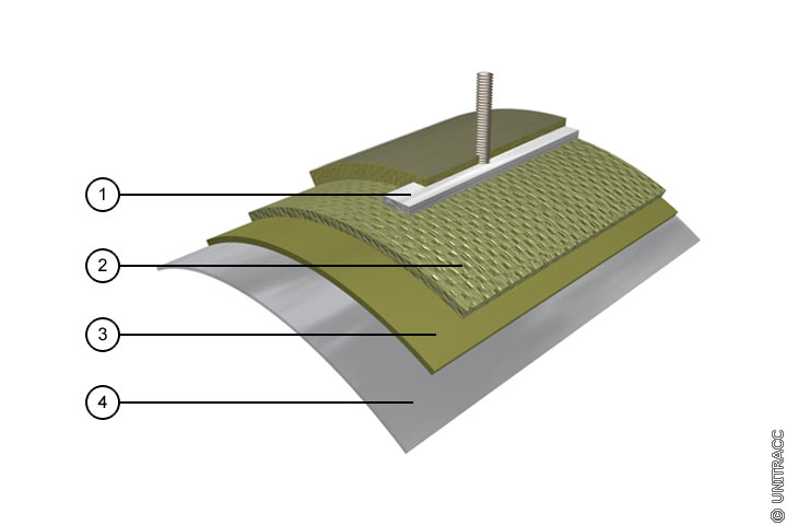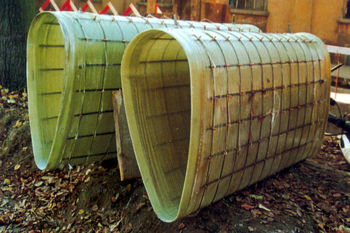 Dem aus GFK-Rohren bestehenden Inliner (Bild 5.3.2.2.2.10-1) (Bild 5.3.2.2.2.10-2) (Bild 5.3.2.2.2.10-3) werden zu diesem Zweck Flachstahlbänder mit aufgeschweißten Kopfbolzendübeln einlaminiert, zusätzlich kann an der Außenseite eine Netzbewehrung angebracht werden.