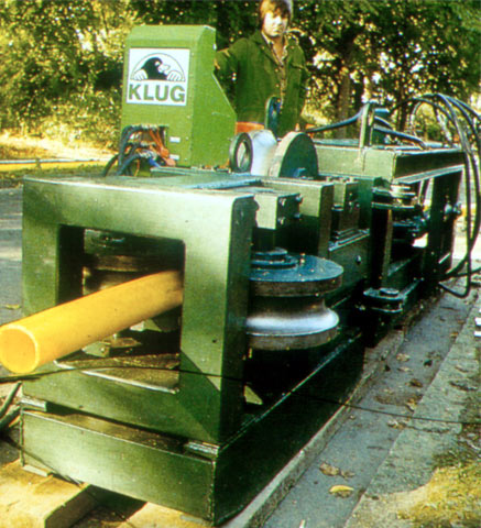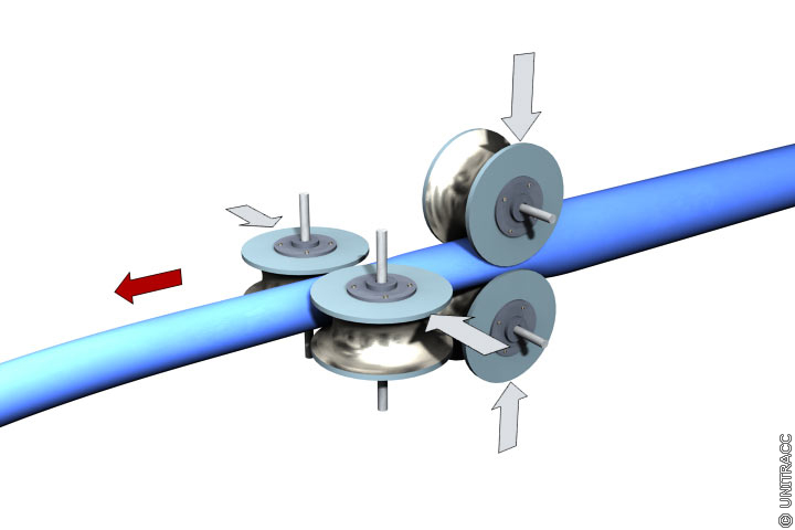 Beim Rolldown-Verfahren erfolgt die temporäre Durchmesserreduzierung des vorgefertigten Rohrstranges mechanisch mit Hilfe einer hydraulisch angetriebenen Greifvorrichtung und zwei oder bei größeren Nennweiten drei um 90° gegeneinander versetzten Halbkugelwalzenpaare (Bild 5.3.2.2.1.4.2.1-1) (Bild 5.3.2.2.1.4.2.1-2) (Bild 5.3.2.2.1.4.2.1-3) (Bild 5.3.2.2.1.4.2.1-4) .