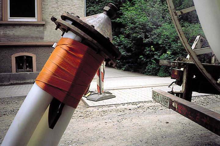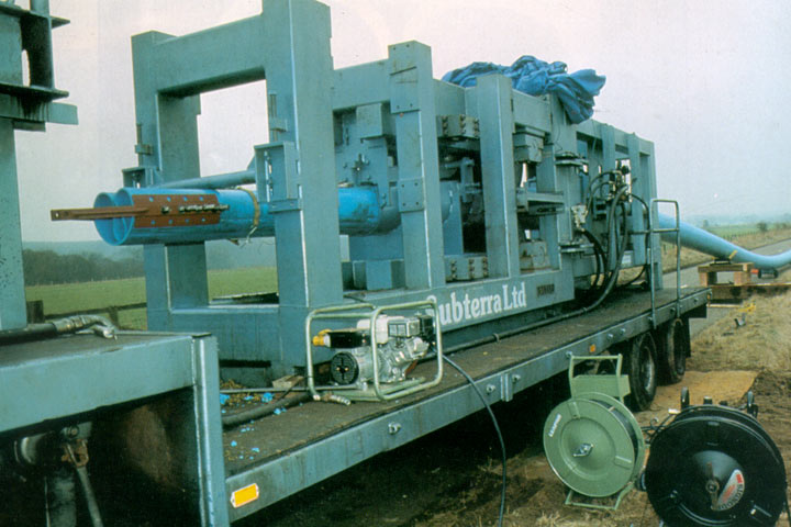 Bei dem in Großbritannien entwickelten Subline-Verfahren ist die Verformung des Rohrstranges in den Einziehvorgang intergriert, d.h. sie erfolgt mit Hilfe eines hydraulisch arbeitenden Verformungs- und Vorschubgerätes vor Ort. Beim Verlassen desselben wird die temporäre C-Form des PE-Rohrstranges durch manuell angebrachte dünne PP-Bänder gehalten (Bild 5.3.2.2.1.4.1.1-12) (Bild 5.3.2.2.1.4.1.1-13) , so daß eine Querschnittsreduzierung von über 40% erreicht werden kann.