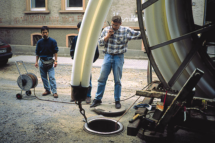 Compact Pipe Verfahren [FI-Wavin] - Einziehen des Rohrstranges über den Schacht |