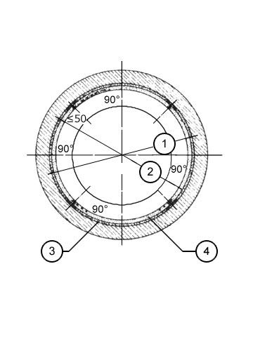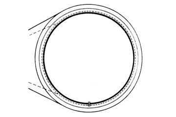 Bei der erstgenannten Variante tritt entweder kein Außenwasserdruck auf oder er wird sicher durch konstruktive Maßnahmen, z.B. durch Anordnung von Entwässerungsöffnungen zum Rohrinneren, entspannt. Bei der Verwendung von PVC-Stegfolien ist bei radialer Steganordnung eine Entspannungsfuge im Sohlenbereich anzuordnen (Bild 5.3.2.5.3-1) . Bei axialer Steganordnung wird das Wasser entlang der Stege zu Querdränagen geführt und dort durch Entspannungsöffnungen im Sohlenbereich abgeleitet. Durch die Herstellung solcher Entspannungsöffnungen und -fugen wird die Dichtwirkung der Auskleidung aufgehoben. Bei der zweiten Variante muß die Auskleidung in der Lage sein, den vollen Außenwasserdruck aufzunehmen.