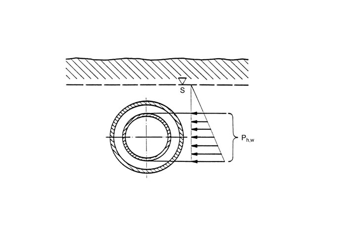Liegen die zu sanierenden Rohrleitungen im Grundwasserbereich wird bei undichten bzw. wasserdurchlässigen Rohren der Kunststoffinliner durch die Grundwassersäule über dem Rohrkämpfer belastet (Bild 5.3.2.6.4.2-1) . Für unverdämmte, drucklos betriebene PE-HD-Rohre ohne seitliche Stützwirkung gelten dann z.B. die in Versuchen ermittelten Beuldrücke pk nach (Bild 5.3.2.6.4.2-3) . Andere empirische und analytische Berechnungsansätze sind im (Abschnitt 5.3.2.6.1) beschrieben.