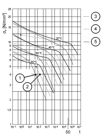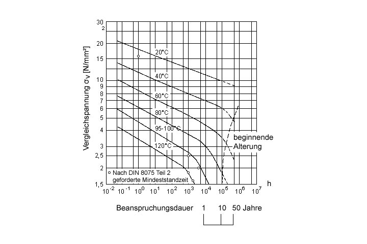 Die der Berechnung zugrundeliegende Vergleichsspannung wird in Abhängigkeit von Betriebstemperatur und Betriebszeit den Zeitstanddiagrammen (Bild 5.3.2.6.4.1-2) (Bild 5.3.2.6.4.1-3) entnommen. Gemäß den jeweiligen Einsatzbedingungen werden die aus dem Zeitstanddiagramm ermittelten Vergleichsspannungen (Mindestwerte) mit Sicherheitsbeiwerten versehen.