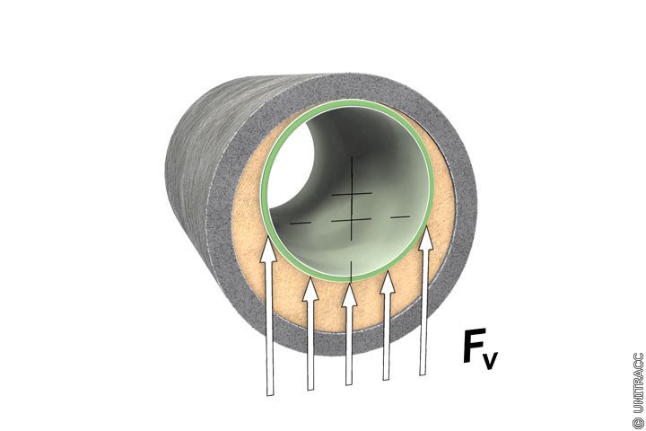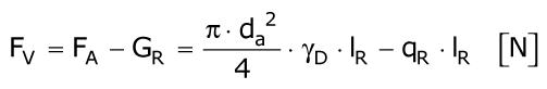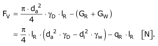 Bei der Verfüllung des Ringraumes zwischen altem Rohr und eingezogenem PE-HD-Rohr mit einem Dämmer vom spezifischen Gewicht γD > γR (γR = spezifisches Gewicht des Rohres) wird das ungefüllte PE-HD-Rohr durch die Kraft Fv (Formel 5.3.2.6.3.2.1) beansprucht (Bild 5.3.2.6.3.2.1-1).