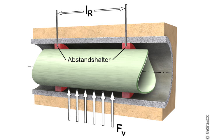 Sofern ein Aufschwimmen der Rohre vermieden werden soll, sind die Rohre mit Abstandhaltern zu zentrieren. Die Abstände auf dem Rohr richten sich nach der zulässigen Durchbiegung (Bild 5.3.2.6.3.2.1-4) (Abschnitt 5.3.2.2.1) .