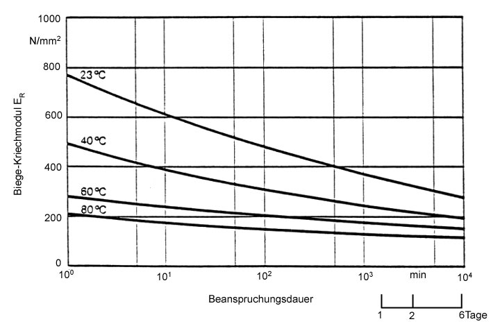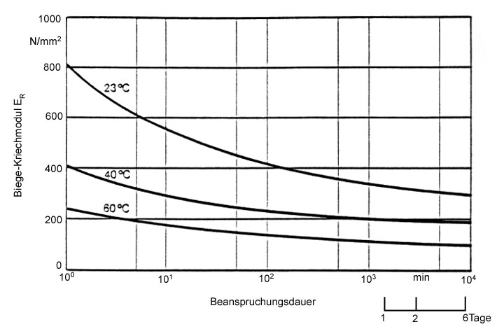 Der Kriechmodul ER des Kunststoff-Rohres ergibt sich in Abhängigkeit von der Abbindezeit des Dämmers nach (Bild 5.3.2.6.3.2.1-2) und (Bild 5.3.2.6.3.2.1-3).