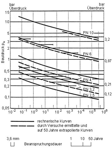 Beuldruck von Rohren aus PE-HD (Hostalen GM 5010 T2) und PP-Copolymer (Hostalen PPH 2222) bei äußerem Wasserdruck und 20° C. Die eingezeichneten Strecken geben Beulbeginn und -ende an [FI-Hoech] [Koch85] |