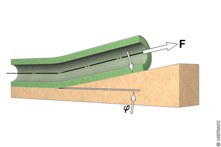 Die Kraft F zum Ziehen eines Rohrstranges mit Steigung oder Gefälle (Bild 5.3.2.6.3.1.1.1-1) ergibt sich aus der Gleichung: