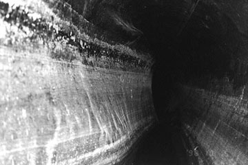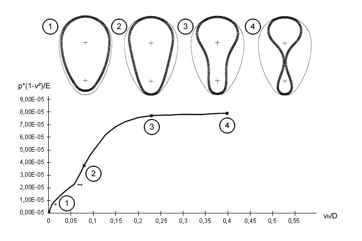 Die geometrisch nichtlineare Berechnung eines Eiquerschnittes unter Auftrieb und Außenwasserdruck als Kontaktproblem mit Spaltbildung zeigt, daß sich der Inliner im allgemeinen symmetrisch verformt und zweiwellig in den Kämpferbereichen beult [Mielk97] . Dies ist darauf zurückzuführen, daß der Eiquerschnitt nicht ideal rund ist und daher auch unter äußerem Wasserdruck stets Biegemomente auftreten, welche einen symmetrischen Verformungsverlauf begünstigen. Eine typische Lastverschiebungskurve ist im (Bild 5.3.2.6.1.3.2-2) dargestellt. Die Verschiebung vh wurde an einem beliebigen Knoten im zu erwartenden Bereich der Maximalamplitude bestimmt, da lediglich der qualitative Verlauf untersucht werden sollte. Im Gegensatz zum Verformungsverhalten des Kreisquerschnitts zeigt der Eiquerschnitt unter Auftrieb und allseitigem äußeren Wasserdruck nur geringe Unterschiede in der Steigung der Last-Verschiebungskurve, ein Verhalten, das ebenfalls auf den großen linearen Biegemomentenanteil zurückzuführen ist. Eine Versteifung des Gesamtsystems ist insbesondere nach dem von der Spaltweite abhängigen Kontaktbeginn im Sohlenbereich im Punkt ** zu beobachten.