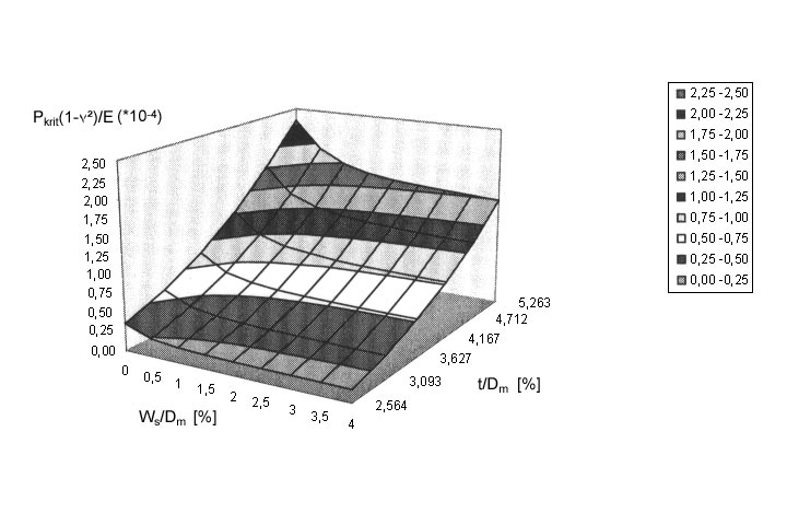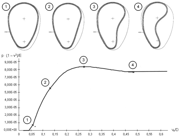 Zunächst zeigt sich durch Einwirkung der Horizontallast im Kämpferbereich eine Anfangsverschiebung des betrachteten Knotens ohne Außendrucksteigerung. Hiernach verformt sich das Rohr unter Auftrieb bis zum Punkt (1) und bei nur geringer Änderung der Kurvensteigung schließlich unter gleichmäßigem äußerem Druck bis zur Maximallast in (3).