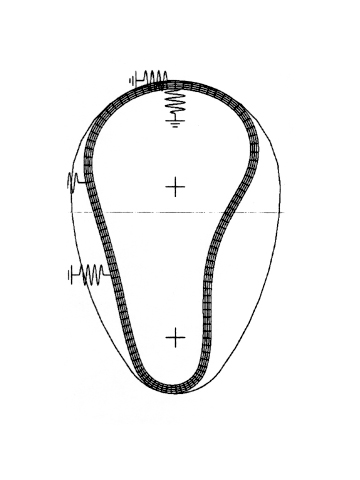 Eine einseitige Verformungsfigur im elastischen Beanspruchungsbereich ist für den unverformten, imperfektionsfreien Eiquerschnitt prinzipiell nur denkbar, wenn an einer Seite Haltekräfte den Biegeverformungen entgegenwirken. Eine typische Verformungsfigur, welche sich in FEM-Berechnungen unter Ansatz haltender Federn im linken Kämpferbereich ergibt, ist im (Bild 5.3.2.6.1.3.2-3) dargestellt. Die Federn wurden in den Berechnungen stets auf Zug beansprucht. Ein derartiger idealer Eiquerschnitt weist somit ohne zusätzliche Behinderung der Verformung stets die Tendenz auf, eine zweiwellige Verformungsfigur einzugehen.