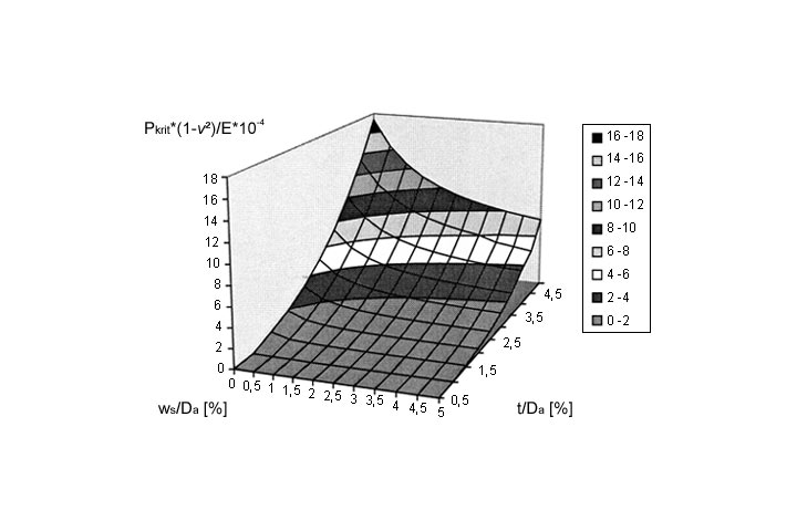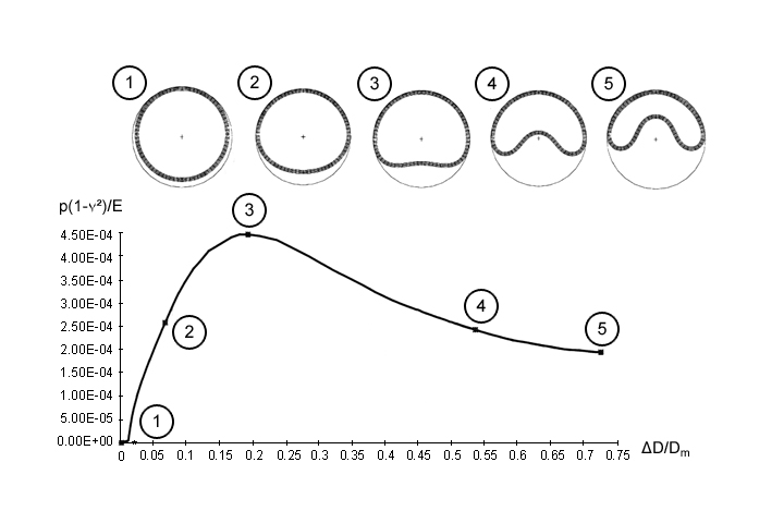 Zu beachten ist, daß je nach Spaltweite bei wachsenden t/Dm - Verhältnissen der Verlauf nicht mehr bis zum Erreichen einer horizontalen Tangente abflacht, sondern das System unter wachsenden Verformungen auch weitere Lasten aufnehmen kann [Mielk97] . Aus dem Durchschlagsproblem wird dann ein Spannungsproblem. Stabilitätsuntersuchungen sind daher auf Wanddicken von etwa t/Dm ≤ 5 % zu beschränken.
