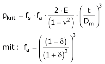 Zunächst wird der Beuldruck des freien unverformten Rohres gegenüber äußerem Wasserdruck entweder aufgrund von Versuchsergebnissen oder nach Gleichung (5-6) (Formel 5.3.2.6.1.2.1) bestimmt. Die aus dem umgebenden Boden herrührende Stützwirkung auf das Rohr wird näherungsweise durch den Stützfaktor fs mit 1 < fs < 3 erfaßt, so daß sich der kritische Außendruck pk1 des gebetteten, unverformten Rohres ergibt zu: