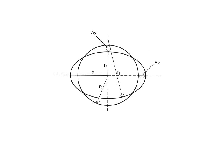 Vorverformungen werden durch einen Verformungsfaktor fa berücksichtigt. Zu dessen Abschätzung wird angenommen, daß sich der Inliner stets elliptisch verformt mit Δr ≈ Δx ≈ Δy (Bild 5.3.2.6.1.2.2-1) .