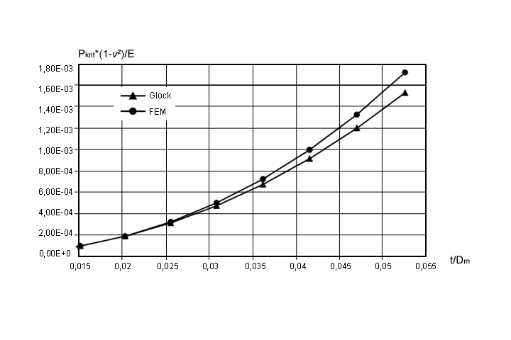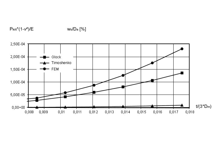 Beim Vergleich der von Glock für das Rohr-im-Rohr-System berechneten Beullastwerte mit denen aus der FEM-Berechnung ermittelten Maximallasten ist zu erkennen, daß sich die Kurven bei kleineren Verhältnissen t/Dm sehr gut annähern (Bild 5.3.2.6.1.4-1) . Die kritische Last steigt jedoch ab ca. t/Dm = 3% in der FEM-Berechnung stärker an als dies nach der Theorie Glocks zu erwarten ist, da das gesamte Vorbeulverhalten vollständig erfaßt wird.