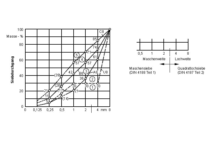 Die Sieblinie muß in der oberen Hälfte des Bereiches 3 oder in der unteren Hälfte des Bereiches 4 nach (Bild 5.3.1.8.1-4) bzw. (Bild 5.3.1.8.1-5) liegen.