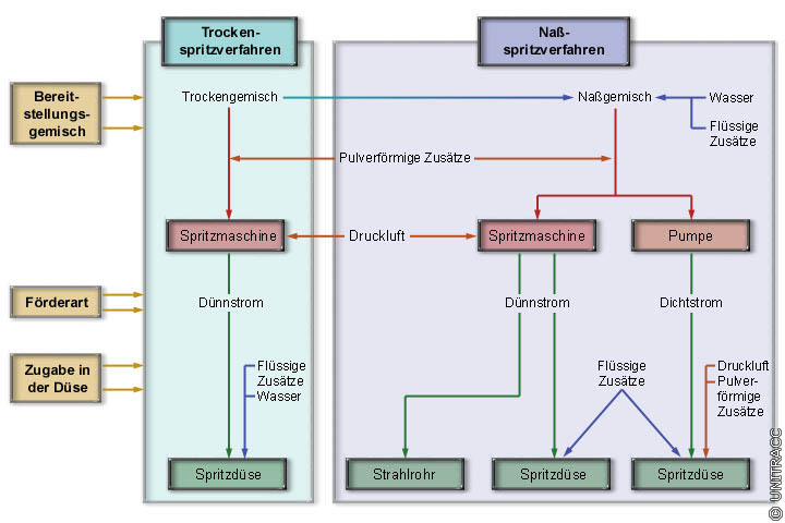 Die einzelnen Abläufe beim Trocken- und Naßspritzverfahren sind im (Bild 5.3.1.8.1-3) dargestellt. Die Zugabe der jeweiligen Zusätze im Bereich der Spritzdüse und deren Regulierung erfolgen durch den Düsenführer.