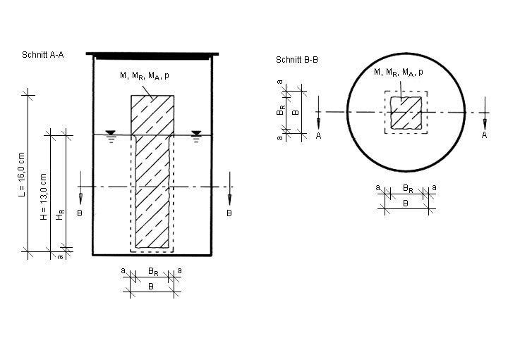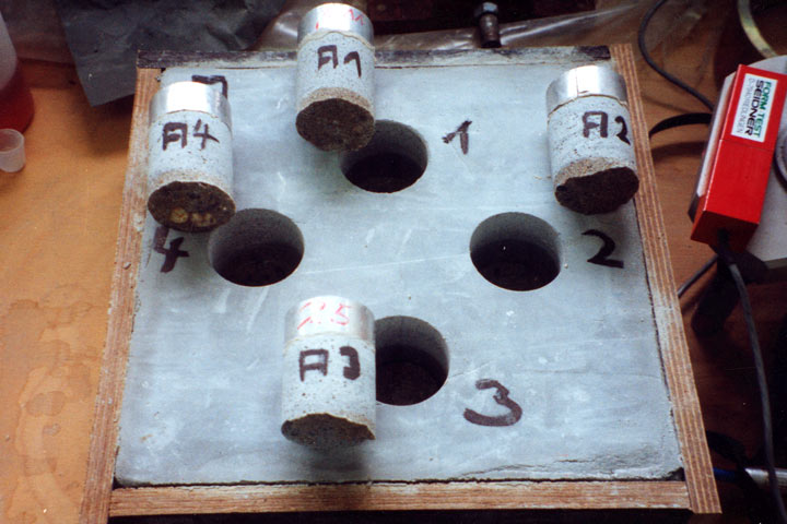 Im Rahmen des Programms werden Mörtelprismen mit den Abmessungen 40x40x160 mm3 hergestellt und bis zur Prüfung 28 Tage in Wasser gelagert. Anschließend erfolgt die Einlagerung der Proben in jeweils 1,4 Liter des agressiven Mediums, so daß diese bis in eine Höhe von 130 mm benetzt sind (Bild 5.3.1.5-1) (Bild 5.3.1.5-2) . Zur Erzielung einer Ergebnisstreubreite von 10 % bei einer Trefferwahrscheinlichkeit von 95 % sind je Prüfmedium 3 Einzelversuche erforderlich. Um eine zuverlässige Aussage zu bekommen, sollte bei jeder Prüfserie ein Referenzmörtel bekannter Zusammensetzung mit geprüft werden.