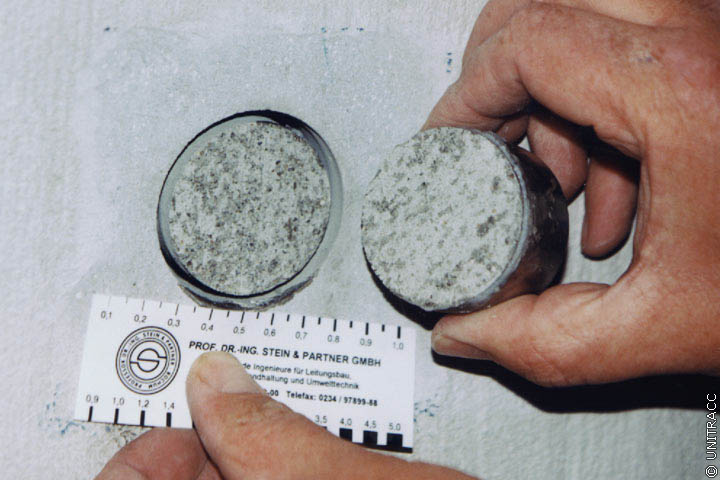 Die Prüfung einer Beschichtung von Kanalisationen umfaßt sowohl die allgemeine Mörtelprüfung, z.B. nach DIN 18555 Teile 1 bis 5 [DIN18555] bzw. den ursprünglich für Zement konzipierten DIN 1164 Teil 1 [DIN1164b] und DIN EN 196 Teil 1 [DINEN196] als auch die Überprüfung bezüglich der kanalspezifischen Anforderungen (Korrosionsbeständigkeit, Wasseraußendruckbelastbarkeit, Abriebfestigkeit, Haftzugfestigkeit, Beständigkeit gegen HD-Spülverfahren etc.). Keines der zur Prüfung der kanalspezifischen Anforderungen zur Zeit eingesetzten Verfahren ist bisher genormt.