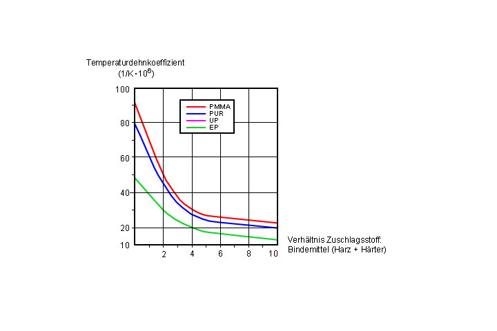 Differieren die Wärmeausdehnungskoeffizienten von Harz und Untergrund, so ergeben sich bei Temperaturänderungen ungünstige Auswirkungen auf die Haftung bzw. den Verbund. Durch Zuschläge und Feinstfüllstoffe mit geringen Temperaturdehnkoeffizienten können die Koeffizienten für den Reaktionsharzmörtel deutlich gesenkt werden, wobei ähnliche Werte wie bei Zementbeton erreicht werden.
