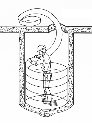 Nach dem Entfernen der Steigeisen, bündigen Abschneiden vorstehender Einläufe, Verschließen der Zuläufe durch Absperrblasen und Reinigen des gesamten Schachtes wird das über eine Umfangslänge des Schachtes auslaufend angeschnittene, 140 oder 280 mm breite Stegprofil (Flap-Loc-Profil) manuell in den Schacht eingewickelt (Bild 5.3.3.2-1) und durch ein speziell konstruiertes Schloß, in welches eine beim nachfolgenden Profil abgehängte Dichtungskante mit Hilfe eines Vibrationshammers eingeschlagen wird (Bild 5.3.3.2-2) (Bild 5.3.3.2-3) , verbunden (Abschnitt 5.3.2.3.1) . Dabei ist darauf zu achten, daß bereits bei der ersten Wicklung das Profil eng an der Schachtwand anliegt, um den entstehenden Ringraum möglichst klein zu halten. Beim Erreichen der Fuge des Schachthalses wird das schräg laufende Profil bündig mit der Bauteilfuge abgeschnitten, so daß eine waagerechte Abschlußfuge entsteht. Weiterhin wird im Bereich der vorher eingemessenen Zuläufe das Profil eingeschnitten, die in den Zuläufen positionierten Absperrblasen in den Schnittkantenbereich Profil/Schachtwandung vorgesetzt, so daß sie gleichzeitig die Funktion einer Schalung für die nachfolgende Ringraumverfüllung (Abschnitt 5.3.2.2.1) übernehmen können, und der Anschlußbereich zwischen Profil und Auftritt mit einem schnell abbindenden Zement abgedichtet.