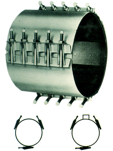 Zur Außenabdichtung örtlich begrenzter Undichtigkeiten, z.B. von Querrissen, begrenzten Rohrbrüchen, undichten Rohrverbindungen (Falzverbindungen) auch kombiniert mit Lageabweichungen geringen Ausmaßes in Horizontal- und Vertikalrichtung, stehen mehrteilige Manschetten aus rostfreiem Stahl mit einer elastomeren Innenbeschichtung zur Verfügung (Bild 5.2.3.1.2-1) .