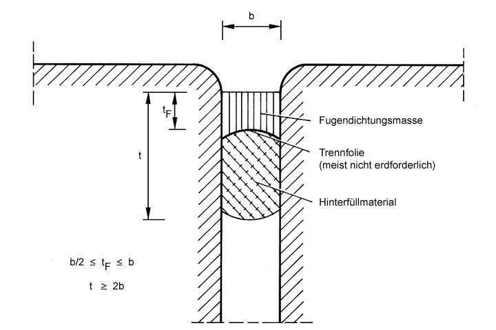 Bei Fugenbreiten größer als 3 cm wird die Fugendichtungsmasse zunächst auf die Fugenflanken gespritzt, zur Erzielung einer guten Haftung gut angespachtelt und anschließend der restliche Querschnitt ausgefüllt [FI-PCI] .
