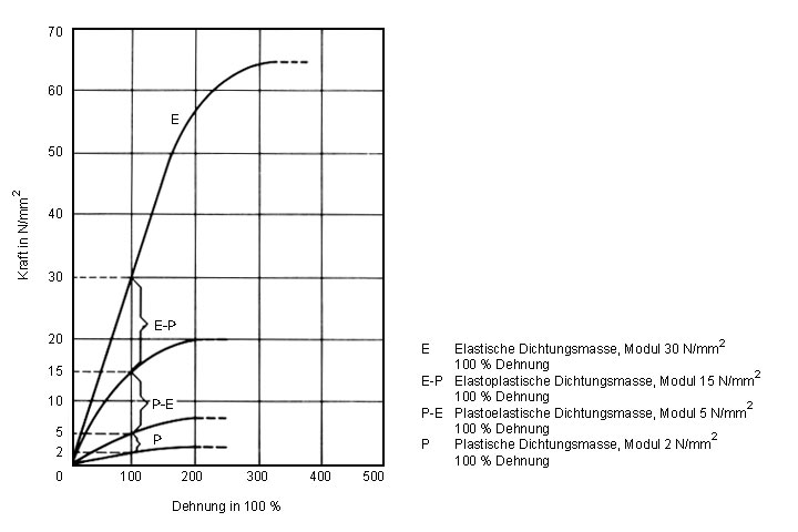 Je nach Verhältnis von elastischen zu plastischen Anteilen lassen sich Dichtstoffe und Fugendichtungsmassen als plastisch, plastoelastisch, elastoplastisch oder elastisch bezeichnen (Bild 5.2.3.2.2.3-1) .