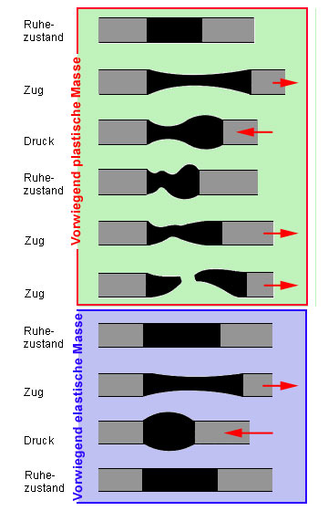 Elastische Massen nehmen nach herbeigeführter Formänderung, Dehnung oder Stauchung und nachfolgender Entlastung ihre Ausgangsform wieder ein, d. h. sie besitzen ein weitgehend reversibles Verformungsverhalten. Das bedeutet aber auch, daß elastische Massen im Gegensatz zu den plastischen die Spannungen nicht abbauen, sondern unter Spannung bleiben. Das führt dazu, daß Zug- und Schubspannungen in den Haftflanken entstehen, die unter Umständen eine Ablösung der Fugendichtungsmasse von den Flanken bewirken. Deshalb sind auch in elastischen Fugendichtungsmassen plastische Anteile erforderlich, die den notwendigen Spannungsabbau bei Dehnungen - vor allem in den Fugenflanken - übernehmen.