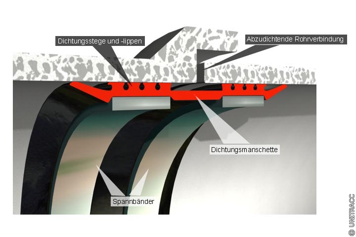 Elastomermanschette mit teilflächger Verspannung (Amex-10-System mit Weco-Seal-Verfahren) - Schnitt durch eine Rohrverbindung mit eingebauter Dichtungsmanschette in Anlehnung an [FI-Wegne] [Quelle: STEIN Ingenieure GmbH] |
