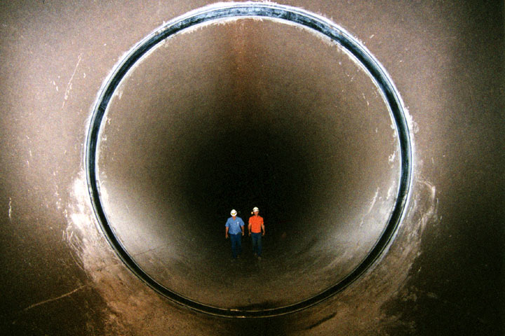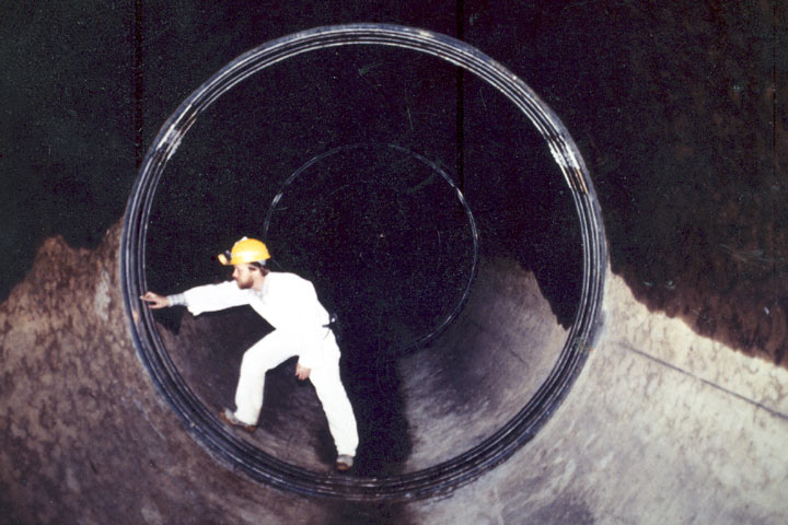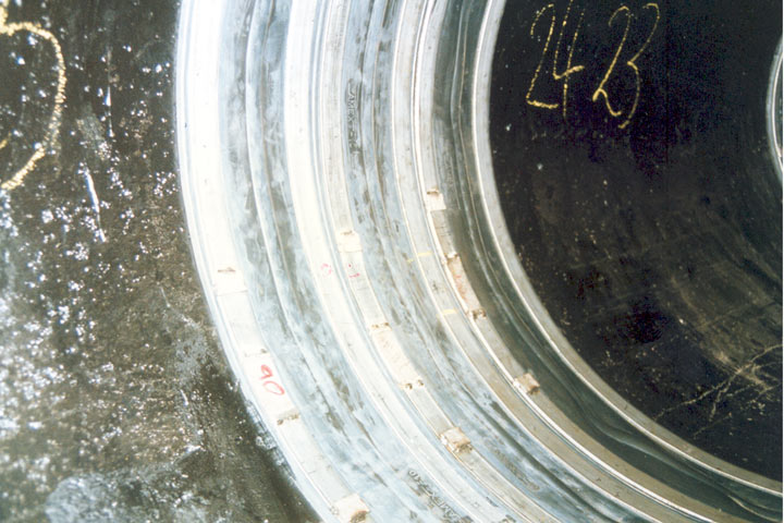 Bei diesem ausschließlich in begehbaren Kanälen oder Schächten eingesetzten Verfahren wird nach einer sorgfältigen Reinigung der Rohrwandungen beiderseits der undichten Stelle eine Elastomer-Dichtungsmanschette von Hand über den abzudichtenden Bereich gelegt und mittels Spannbändern gegen die Rohrwandungsflächen gepreßt (Bild 5.2.3.2.3.7.1-1) (Bild 5.2.3.2.3.7.1-2) (Bild 5.2.3.2.3.7.1-3) (Bild 5.2.3.2.3.7.1-4) (Bild 5.2.3.2.3.7.1-5) .