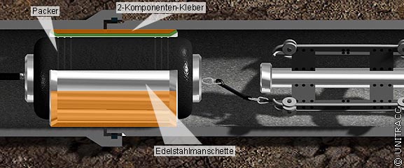 Auch diese Innenmanschette wird mit einem Packer zur Schadensstelle transportiert und dort bis zum Einrasten eines Schnellverschlusses aufgeweitet. Dabei werden Innenmanschette und Altrohr miteinander verklebt.