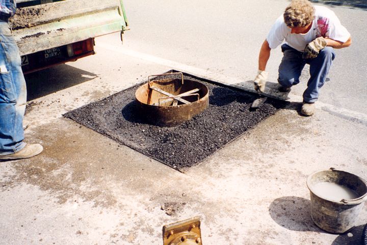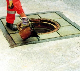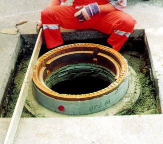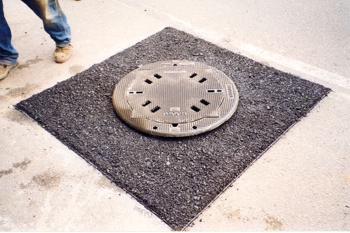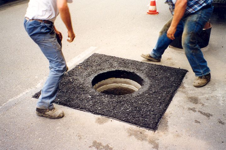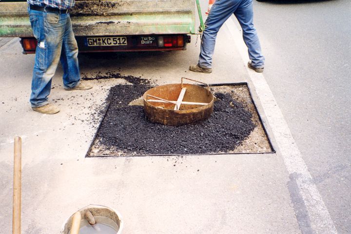 Eine weitere Sanierungsmöglichkeit stellt das Herstellen der Fugenzwischenlagen und der Umgebung der Schachtabdeckung mit Gußasphalt (Bild 5.2.1.1.2-30) unter Verwendung einer Metall-Schachtschalung dar (Bild 5.2.1.1.2-5) (Bild 5.2.1.1.2-6) (Bild 5.2.1.1.2-7) (Bild 5.2.1.1.2-8) (Bild 5.2.1.1.2-9) (Bild 5.2.1.1.2-10) (Bild 5.2.1.1.2-11) (Bild 5.2.1.1.2-12) .
