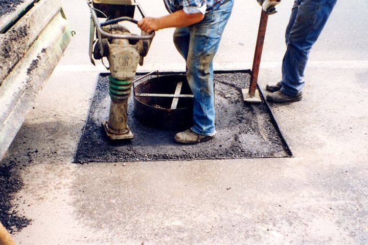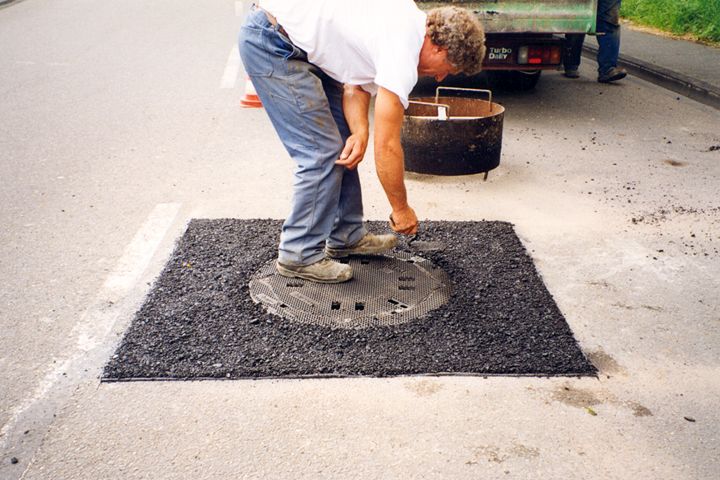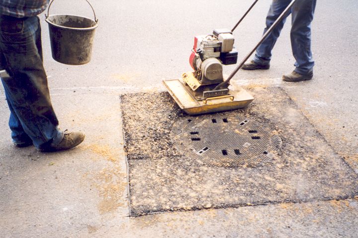 - Wiederherstellung der bituminösen Trag- und Deckschicht und gleichzeitiges Anheben des Rahmens der Schachtabdeckung.
