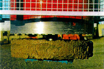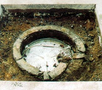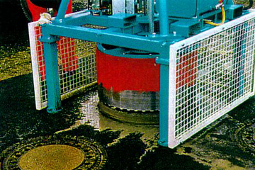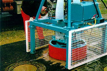 Diese Arbeiten können bei kreisförmigen Schachtabdeckungen auch maschinell mit Hilfe eines für alle Schaufellader, Bagger und LKW-Ladekrane geeigneten Zusatzgerätes erfolgen [FI-SHARK] . Es handelt sich hierbei um ein kombiniertes, hydraulisch angetriebenes Bohr- und Hebegerät, welches nach Entfernen des Schachtdeckels von Hand über der Schachtabdeckung positioniert wird. In der Bohrkrone ist eine hydraulische Spreize angebracht, die in den Schacht gesenkt und in der Mörtelfuge, bis zu welcher die Schadensbehebung erfolgen soll, verspreizt wird. Anschließend wird die Schachtabdeckung bis zur gewünschten Tiefe überbohrt (Bild 5.2.1.1.2-13) (Bild 5.2.1.1.2-14) (Bild 5.2.1.1.2-15) (Bild 5.2.1.1.2-16) (Bild 5.2.1.1.2-17) . Nach Beendigung des Bohrvorganges werden mit der Bohrkrone und der Spreizkonstruktion gleichzeitig der Schachtrahmen und gegebenenfalls der oder die Auflageringe sowie das Bohrgerät aus der Deckschicht herausgehoben. Der erneute Einbau des Rahmens kann entsprechend den oben erläuterten Varianten geschehen. Die durch das Ausbohren entstandene Fuge rund um den Rahmen ist nur etwa 3 cm breit. Sie kann mit einem speziellen Kunststoffgießmörtel vergossen werden.