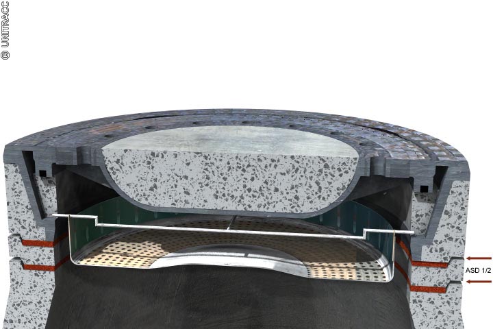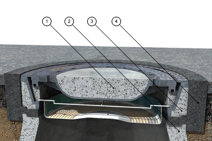 Die Spezial-Auflagerringe werden in einer gegenüber der Wanddicke des Schachtes deutlich breiteren Ausführung eingesetzt, so dass zur Lastabtragung der Straßenoberbau und der Schachthals herangezogen werden. Die speziell geformten Beton-Umrandungssteine werden in Ortbeton verlegt, wobei der erneuerte Bereich des Straßenoberbaus deutlich über den Querschnitt der Schachtabdeckung bzw. des Schachthalses hinausgeht. Die Verfugung der Formsteine erfolgt bis 5 cm unter Oberkante mit Beton und danach mit bituminösem Fugenverguß (Animation 5.2.1.1.2-1) .