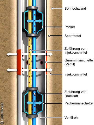 Bei der Injektion mit Manschetten- bzw. Ventilrohren wird eine verrohrte Bohrung bis zur gewünschten Endtiefe niedergebracht und nach Reinigung dieser Verrohrung ein Kunststoffrohr DN 30 bis 60 eingeführt.