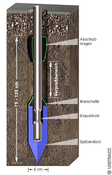 Hinsichtlich der Injektionstechnik haben sich in der Praxis eine Vielzahl von Verfahren durchgesetzt [Maidl83b] . Für den vorliegenden Anwendungsfall kommen vornehmlich die Injektion mit der Rammlanze oder mit Manschettenrohren zum Einsatz.