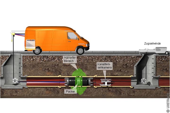 Im Bereich der jeweiligen Schadensstelle wird ein Packer unter Beobachtung mit einer TV-Kamera positioniert, der die Injektion ermöglicht (Bild 5.2.2.4.1.1.1.1-1) .
