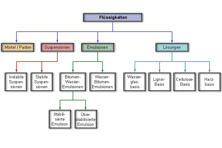 Einen Überblick über die für Injektionen verwendbaren Flüssigkeiten, geordnet nach der Teilchengröße der dispergierten Stoffe bzw. der Viskosität, vermittelt (Bild 5.2.2.1-1) . Von diesen Injektionsmitteln, die im injizierten Bereich gelieren oder aushärten, sind heute nur noch die Zementpasten und -mörtel, Suspensionen aus Zement, Ton oder Kombinationen beider Mittel sowie Lösungen auf der Basis von Wasserglas und Kunststoffen gebräuchlich.