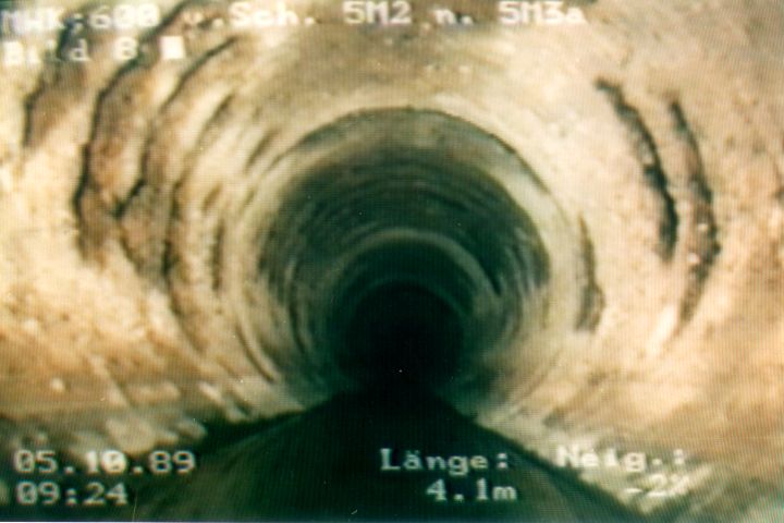 Korrosion der gesamten Rohrinnenfläche eines Betonkanals - Kamerabild [FI-IfK] |