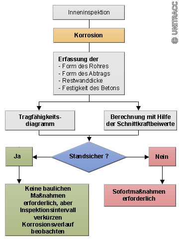 Die bei einer Inneninspektion festgestellte Korrosion wird in Abhängigkeit der Rohrform, der Restwanddicke, der Form des Abtrages und der Betonfestigkeit aus baulicher Sicht beurteilt. Dazu wird eine statische Berechnung mit Hilfe der erstellten Tragfähigkeitsdiagramme oder unter zu Hilfenahme der Schnittkraftbeiwerte für das korrodierte Rohr durchgeführt. Das Ergebnis dieser Berechnung gibt Aufschluß darüber, ob der Kanal noch standsicher ist oder nicht und welche Maßnahmen erforderlich sind.