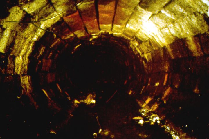 Auch bei gemauerten Kanälen kann insbesondere bei zementgebundenem Fugenmörtel Korrosion auftreten. Die Schadensfolgen erstrecken sich vom teilweisen oder vollständigen Abtragen oder Auswaschen des Fugenmörtels bis hin zum Herausfallen einzelner Klinker aus dem Verband (Bild 2.6.4-5) (Bild 2.6.4-6) (Bild 2.6.4-7) oder im Extremfall bis zum vollständigen Einsturz der Klinkerringe (Abschnitt 2.8.5.1) .