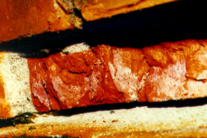 In Einzelfällen wurden auch großflächige Abplatzungen an den Klinkern selbst, insbesondere im Scheitel- und Kämpferbereich, beobachtet [Frank92] [Hahn28] (Bild 2.6.4-8) . Nach [Frank92] kann auch hier als Ursache die Biogene Schwefelsäurebildung angesehen werden. Der auf diese Art erfolgte Sulfateintrag in die Klinker hat eine Bildung von Salzen (hauptsächlich Gips) zur Folge, die durch Kristallisationsdrücke die beobachteten Abplatzungen hervorrufen. Vorraussetzung für dieses Phänomen sind Klinker mit produktionsbedingten Fehlstellen.