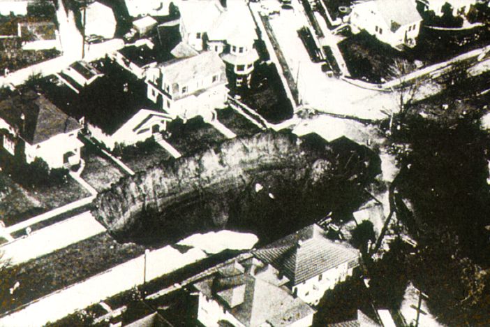 Hohlraumbildung und großflächiger Einsturz desselben infolge nicht fachgerecht verschlossener Dränage und Undichtigkeiten bei einem Abwasserkanal in Seattle [Quick79] - Blick auf den Straßeneinbruch, Krater an der Geländeoberfläche |